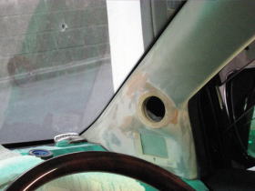 | 養生して、取付位置をマーキング | 養生をはがし、内部にステーをいれ |